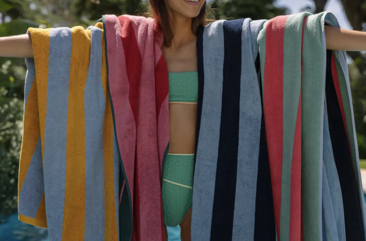 Las toallas de la colección Pena están disponibles en 4 colores, con 8 variaciones: amarillo con naranja y amarillo con azul, rosa con verde y rosa con rojo, verde con azul claro y verde con coral, azul marino con blanco y azul marino con azul claro.